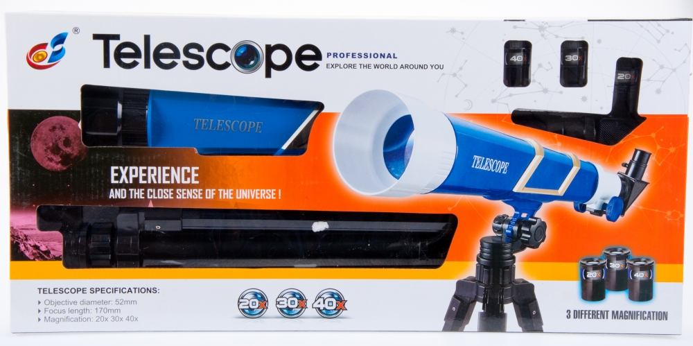 Zalety produktu Teleskop to narzędzie, które służy do obserwacji odległych obiektów poprzez zbieranie promieniowania elektromagnetycznego np. światła widzialnego , posiada wymienne soczewki o 20,30 i 40 krotnym powiększeniu.
