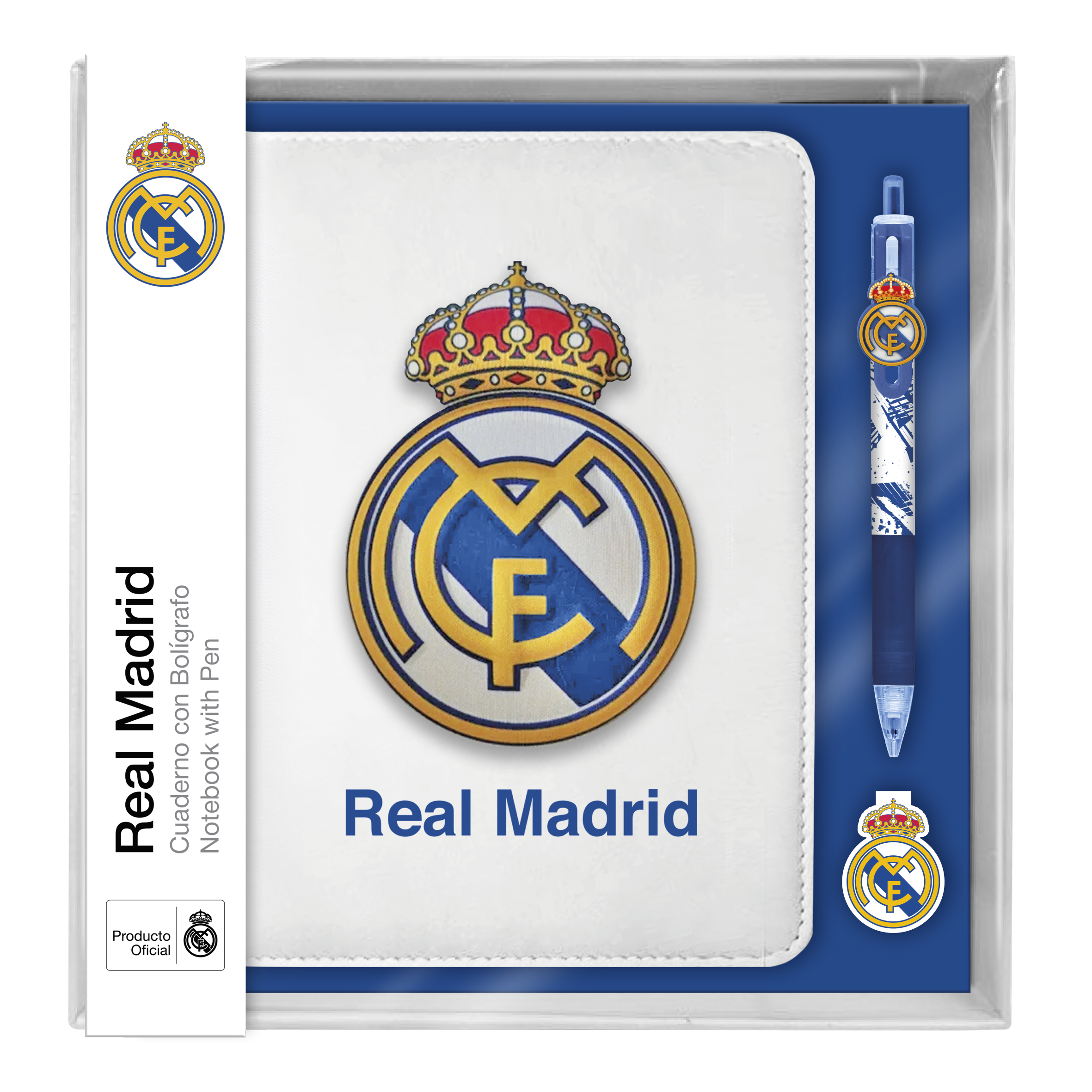 "Niezbędny zestaw dla prawdziwych fanów Realu Madryt. Zawiera notatnik A5 z kartkami w linie, idealny do notatek, pomysłów lub treningu mentalnego. Jego okładka wykonana jest z wyściełanej pianki EVA, z wypukłym herbem klubu, nadając mu odporne wykończenie i prezencję.Zestaw uzupełnia pasujący długopis i zakładka w kształcie herbu Realu Madryt, idealne do oznaczania stron z dumą klubu.Design, użyteczność i pasja do kolorów. Wszystko w jednym zestawie".