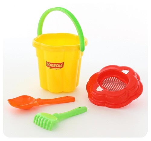 Zestaw do piaskownicy: wiaderko-kwiatek duże, sito-kwiatek duże, łopatka, grabki
