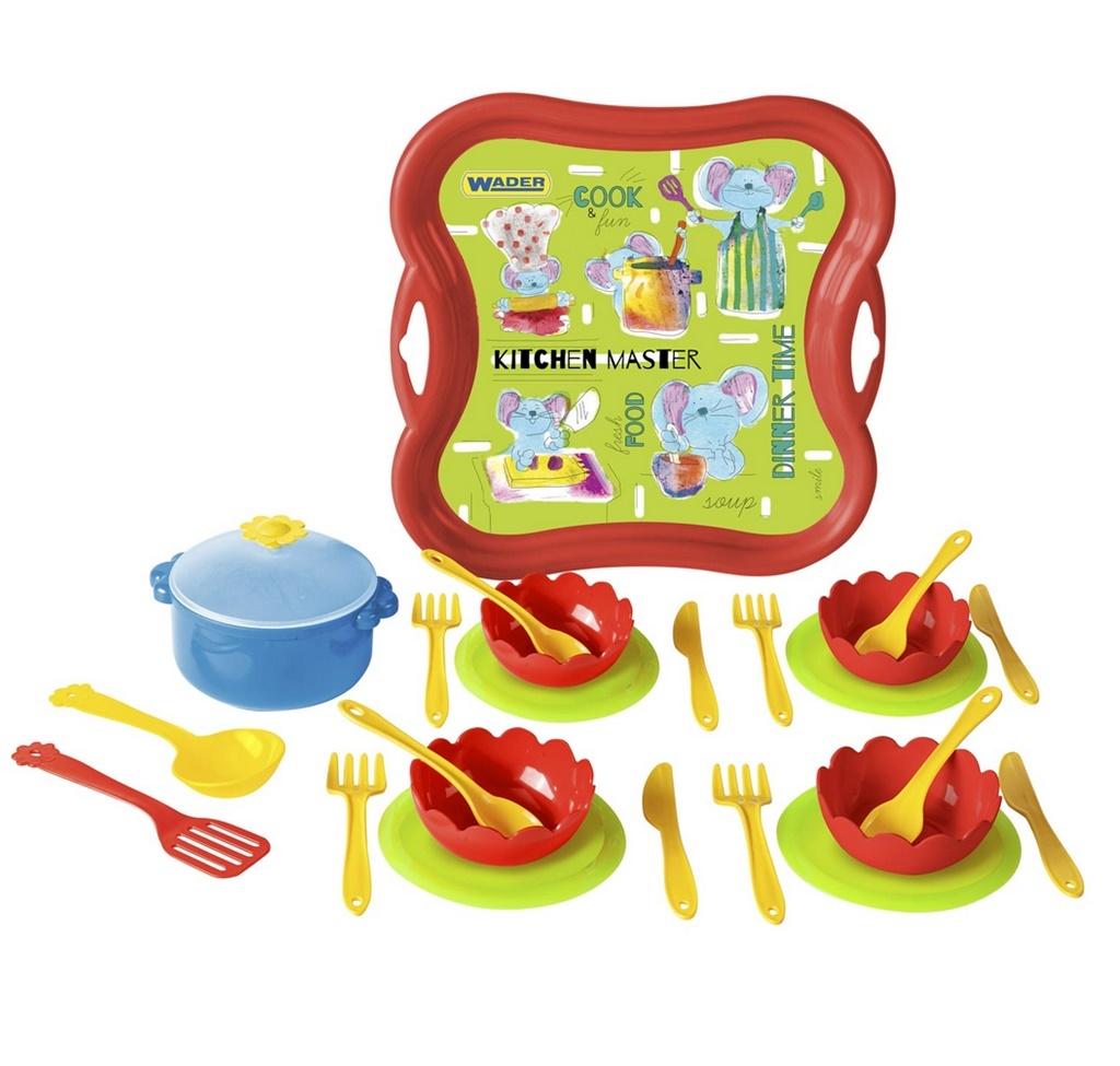 -w skład zestawu wchodzi 24 elementów: taca z uchwytem, 4 talerzyki, 4 miseczki, garnek z pokrywką, 4 komplety sztućców i 2 łopatki kuchenne