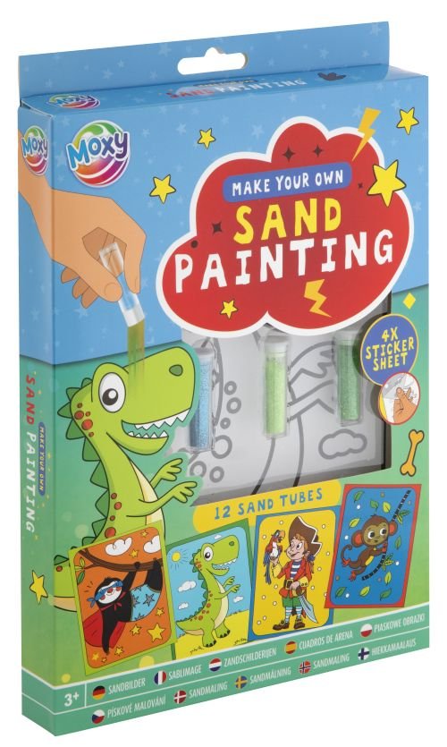Nowa, kreatywna forma spędzania czasu dla dzieci-obrazki do pokrywania kolorowym piaskiem. Obrazki zawierają pola pokryte klejem, które po ich odsłonięciu można posypywać piaskiem i w ten sposób je kolorować. Każdy obrazek to kolejna okazja do wyboru najciekawszych połączeń kolorów. Zestaw zawiera: