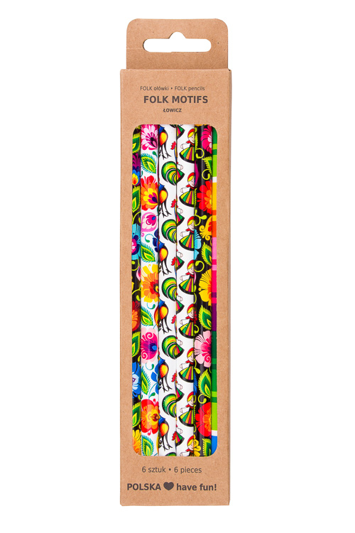 - w zestawie 6 ołówków: łowiczanka, koguciki, pawie, biały łowicki, 2 x czarny łowicki