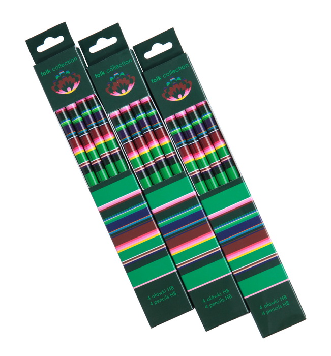 Zestaw 4 ołówków z poziomym motywem folkowym pasiaka łowickiego, w kolorowym opakowaniu z okienkiem.