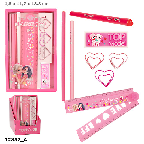 Zestaw papierniczy TOPModel, w zestawie składana linijka 30cm, 3 ołówki HB, gumka do ścierania i 3 spinacze do papieru w kształcie serca. Zestaw w pudełku z pokrywką z przezroczystego plastiku.