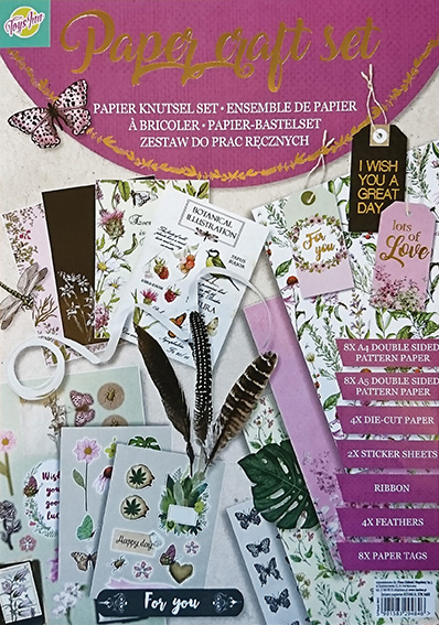 Zestaw papierów do prac ręcznych Botanical: - 8 dwustronnych kolorowych kart A4 - 8 dwustronnych kolorowych kart A5 - 4 arkusze wstępnie naciętymi elementami dekoracyjnymi - 8 zawieszek - karnetów - 2 arkusze naklejek - 4 piórka - wstążka