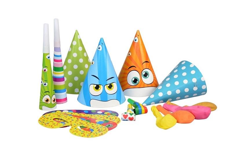 Zestaw akcesoriów imprezowych, w skład którego wchodzą: 4 czapeczki papierowe z gumką, 2 gwizdki, 2 trąbki, 4 maski papierowe z gumką oraz 4 balony lateksowe w pastelowych kolorach. Kolorowy zestaw do wspólnego świętowania urodzin, jubileuszy, powitania nowego roku. Uniwersalny komplet akcesoriów na przyjęcie. Maski oraz czapeczki wyposażone zostały w elastyczną gumeczkę umożliwiające wygodne noszenie. Gadżety imprezowe o wymiarach: - czapeczka wys. 16 cm (średnica 10 cm), - maska szer. 16 cm, - trąbka wys. 19 cm, - gwizdek 9 cm (rozwinięty 2,5x35 cm), - balony pastelowe o średnicy 25 cm po napompowaniu.