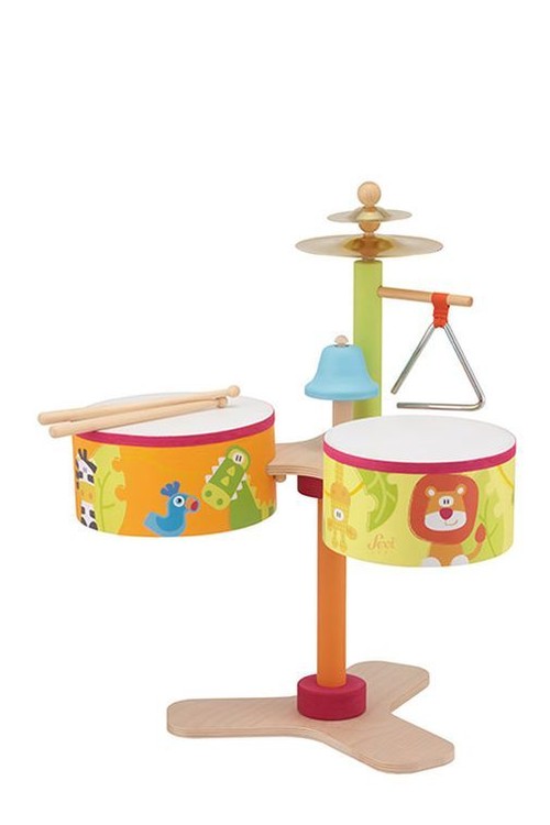 Perkusja Sevi zawiera: 2 bębenki, trójkąt, talerze, dzwonek i 2 pałeczki do gry. Wiek: 3+