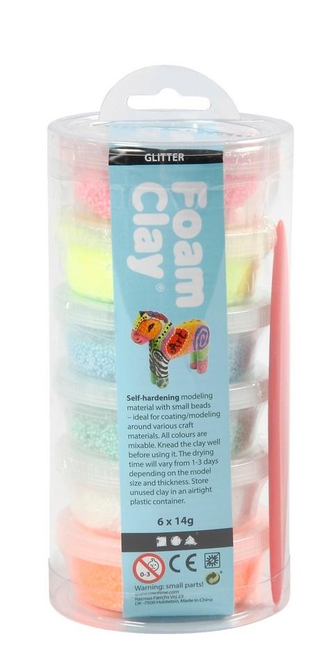 asortyment samoutwardzalnego materiału modelującego -małymi koralikami -idealny do powlekania / modelowania wokół różnych materiałów rzemieślniczych -6 kolorów brokatowych -6x14 g. Kolory w zestawie: niebieski, żółty, zielony, biały, pomarańczowy, różowy.