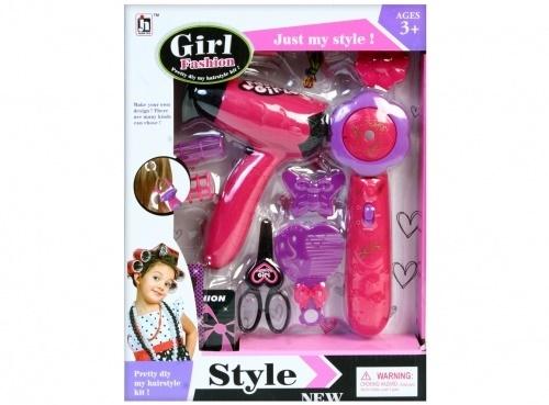 Zestaw zawiera: maszynę do zaplatania włosów, suszarkę do włosów, wałek do włosów, nożyczki, spinki oraz grzebień. Maszynka do włosów po naciśnięciu przycisku zaplata pasmo włosów, suszarka wydaje odgłosy suszenia. Zestaw posiada 11 elementów do stylizacji włosów. Produkt wykonany z plastiku. Przeznaczony dla dzieci od lat 3. Wymaga zasilania bateriami 2xLR44.