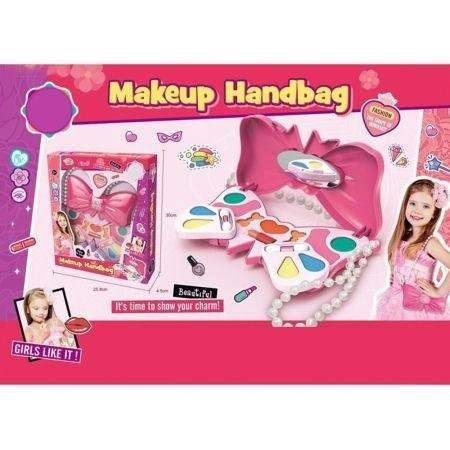 Zestaw piękności, torebka w kształcie kokardki. Jest to zestaw do makijażu,w zestawie cienie do powiek, róż do policzków, szminka i inne akcesoria.