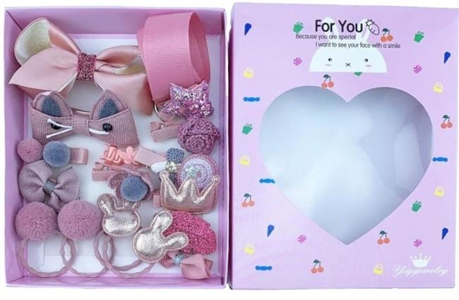 Podaruj swojej małej księżniczce ten fantastyczny zestaw uroczych akcesoriów do włosów! Ten bogaty komplet zawiera różnorodne spinki i gumki, które pozwolą na tworzenie niezliczonych, dziewczęcych stylizacji. Wśród nich znajdziesz miękkie pompony, eleganckie kokardki, urocze kwiatki, zabawne uszka króliczka, błyszczące gwiazdki oraz inne śliczne detale. Dominująca kolorystyka w odcieniach różu sprawia, że akcesoria są niezwykle dziewczęce i stylowe. Wykonane z dbałością o szczegóły, są nie tylko piękne, ale także trwałe i bezpieczne dla delikatnych włosów dziecka. Elastyczne gumki dobrze trzymają włosy, nie ciągnąc ich, a solidne spinki pewnie utrzymują fryzurę przez cały dzień. Zestaw jest zapakowany w estetyczne, różowe pudełko z okienkiem w kształcie serca, co czyni go idealnym pomysłem na prezent na urodziny, Dzień Dziecka lub inną specjalną okazję. Dzięki takiemu wyborowi akcesoriów każda dziewczynka poczuje się wyjątkowo i stylowo każdego dnia!