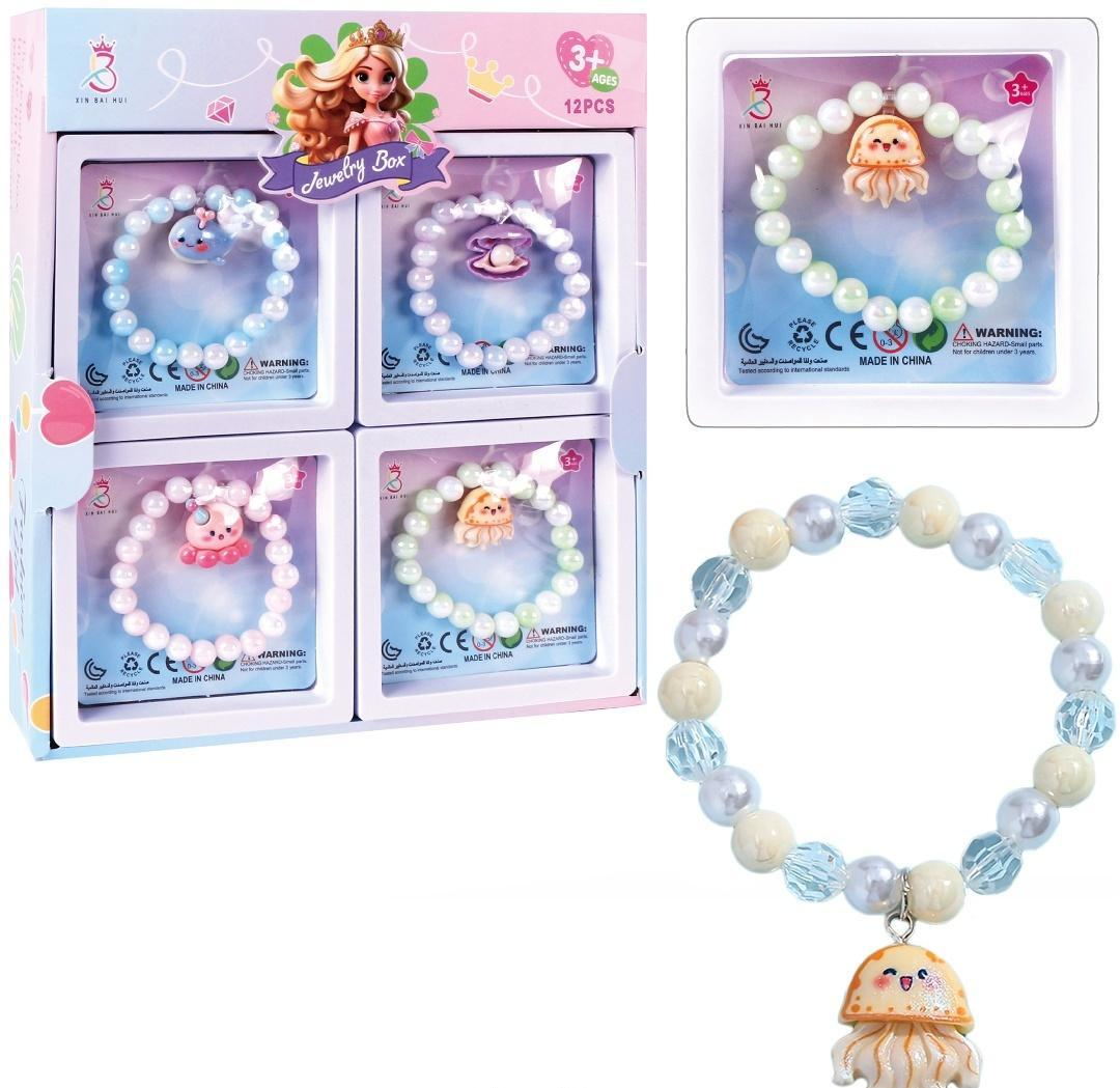 Zestaw Bransoletek "Jewelry Box" z Morskimi Stworzeniami - Perłowe Uroki dla Dziewczynek! Przedstawiamy czarujący zestaw bransoletek "Jewelry Box", który przeniesie każdą dziewczynkę w podwodny świat pełen morskich stworzeń i błyszczących koralików! To idealny prezent dla małych miłośniczek biżuterii, które marzą o podwodnych przygodach. Główne cechy produktu: Perłowe koraliki i kryształki: Bransoletki wykonane są z koralików imitujących perły (w kolorach białym, kremowym, jasnoniebieskim) oraz lśniących, fasetowanych koralików przypominających kryształki, które pięknie mienią się w świetle. Urocze zawieszki morskie: Każdą bransoletkę zdobi urocza zawieszka w kształcie morskiego stworzenia, np. meduzy, gwiazdki morskiej, muszli, czy delfina. Zawieszki są kolorowe i dodają bransoletkom unikalnego charakteru. Indywidualne opakowania: Każda bransoletka jest zapakowana w małe, przezroczyste pudełeczko w kształcie serca lub kwiatka, idealne do przechowywania biżuterii, a także sprawia, że zestaw jest od razu gotowy na prezent. Pudełeczka posiadają dekoracyjne tło z motywami podwodnego świata i napisem "Jewelry Box". Rozwija kreatywność i poczucie estetyki: Noszenie biżuterii pozwala dzieciom wyrażać siebie i rozwijać własny styl. Idealne na różne okazje: Doskonałe na prezent urodzinowy, imieninowy, Dzień Dziecka, jako nagroda lub upominek dla uczestników przyjęcia. Bezpieczne dla dzieci: Bransoletki wykonane są z bezpiecznych materiałów, odpowiednich dla dzieci. Zalecany wiek: 3+ (zgodnie z oznaczeniem na opakowaniu). Wielkość pojedynczego opakowania 9x9x1 cm Podaruj małej damie radość z posiadania własnej biżuterii inspirowanej morskimi głębinami z zestawem bransoletek "Jewelry Box"!