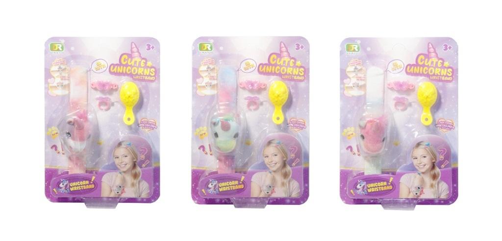 Magnetyczna pluszowa bransoletka z jednorożcem w zestawie z pierścionkiem, spinką i szczotką. Produkt występuje w kilku wersjach kolorystycznych, wybierany losowo. Cena dotyczy jednej sztuki. Zabawka zapakowana w kartonową podstawkę z przezroczystym kloszem. Produkt dla dzieci od 3 lat. Podane wymiary sa wymiarami opakowania.