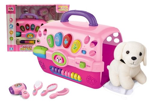Wielu kilkuletnich fanów zwierzątek pragnie zostać w przyszłości weterynarzem lub właścicielem salonu piękności dla zwierząt. Warto jest zatem rozwijać taką pasję od najmłodszych lat metodami najbardziej pasującymi dziecku - przez zabawę! Przenośny salon piękności z przyjaznym pieskiem to wspaniała zabawka, która pozwala nauczyć się odpowiedzialności i dbania o zwierzęta. Radosne zwierzątko o jasnym umieszczeniu może być czesane, szczotkowane, a także suszone za pomocą dołączonych do zestawu akcesoriów. Sam transporter również posiada wiele interaktywnych funkcji: drzwiczki otwierają się i zamykają, w dolnej części nosidełka znajduje się liczydełko, a główna ścianka posiada na sobie świecące przyciski. Za pomocą ruchomych przełączników można regulować głośność zabawki, a także przełączać ją z trybu rozgrywki do trybu muzyki. Opakowanie zabawki wyposażone jest w duży otwór, dzięki któremu można dokładnie obejrzeć zawartość bez rozrywania kartonu. Do uruchomienia oświetlenia i dźwięków niezbędne są dwie baterie AA (nie dołączone do zestawu). Wymiary opakowania: 37 cm x 28 cm x 18 cm . Waga w opakowaniu: 1 kg.