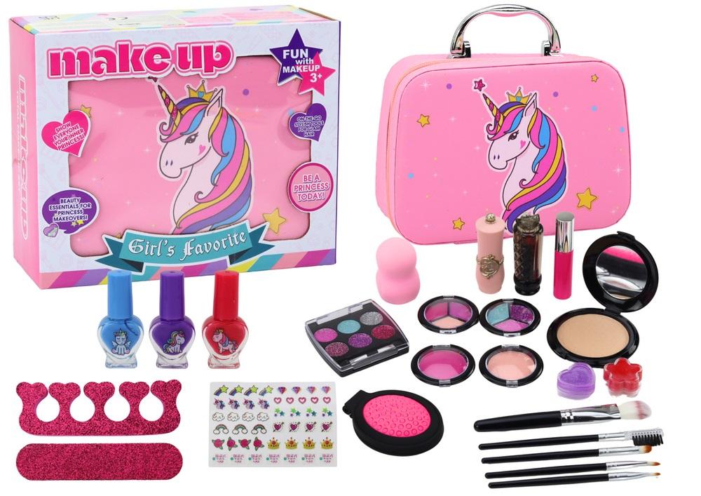 Zestaw Piękności Do Makijażu Kosmetyki W Różowym Kuferku Jednorożec 27 El. Wyjątkowy zestaw piękności, który przeniesie Twoje dziecko w magiczny świat makijażu! Różowy kufer z motywem uroczego jednorożca kryje w sobie wszystko, czego potrzebuje młoda artystka do kreatywnych eksperymentów z wyglądem. W skład zestawu wchodzą 3 lakiery do paznokci o intensywnych kolorach (czerwonym, niebieskim i fioletowym) oraz zestaw pędzli, który umożliwia precyzyjne wykonanie makijażu, zachęcając do tworzenia niesamowitych wzorów na twarzy. Ale to nie koniec! Nasz zestaw to także 2 szminki w różnych odcieniach, by dziecko mogło wybierać spośród różnorodnych kolorów i wyrażać siebie poprzez makijaż ust. Szczotka do włosów pozwoli na kreowanie każdej fryzury, a pojemnik na perfumy umożliwi przenoszenie ulubionego zapachu. Ponadto, w naszym zestawie znajdziesz róż, cienie do powiek oraz błyszczyki, które dodadzą blasku i uroku każdemu makijażowi. Naklejki na paznokcie, gąbeczka do makijażu, pilniczek i separator kosmetyczny to tylko niektóre z dodatkowych akcesoriów, które pomogą w pełnym przygotowaniu i pielęgnacji. Wymiary naszej magicznej szkatułki to 20cm x 15cm x 7cm, idealne do przechowywania. To niezwykły zestaw, który inspiruje do twórczych eksploracji w świecie urody i kolorów, jednocześnie zachęcając do rozwijania wyobraźni i kreatywności! Elementy zestawu: - różowa szkatułka z motywem jednorożca - gąbeczka do makijażu - butelka na perfumy (pusta) - 3 paletki z cieniami do powiek (zwykłe oraz brokatowe) - 2 róże - puder - 2 szminki ( różowa i czerwona) - 3 błyszczyki (różowy z brokatem, fioletowy i czerwony) - pilniczek - separator kosmetyczny - szczotka do włosów - 3 lakiery do paznokci (czerwony, fioletowy, niebieski) - naklejki na paznokcie - zestaw 5 akcesoriów do malowania twarzy - puszek do pudru Wymiary kuferka: 20cm x 15cm x 7cm Wymiary opakowania: 20,5cm x 16,5cm x 8cm Posiada certyfikat CE, ponadto jest zgodny z normą EN71. Przeznaczony dla dzieci powyżej 3 roku życia.