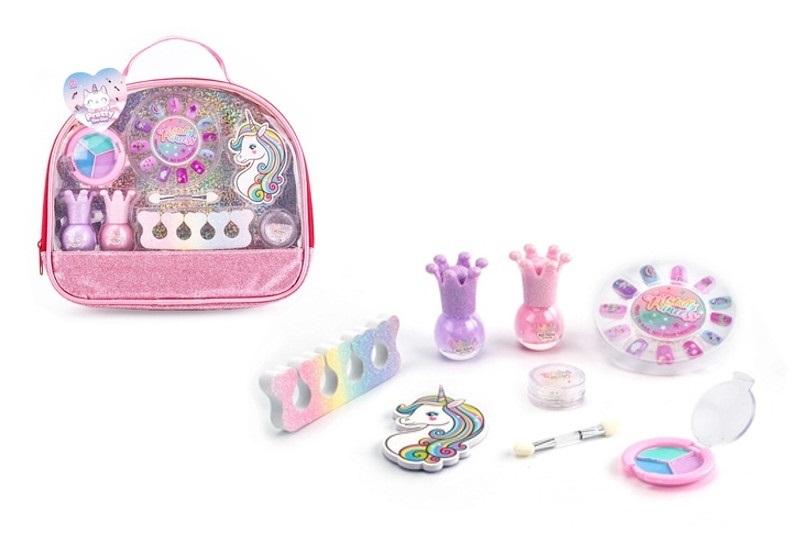 Zestaw do paznokci z kolorowymi lakierami pozwoli stworzyć dziewczynkom niezwykły manicure. W zestawie także także pilniczek, separator, tipsy które nie potrzebują kleju, cienie do powiek z aplikatorami. Produkt zapakowany brokatową kosmetyczkę. Podane wymiary są wymiarami opakowania.