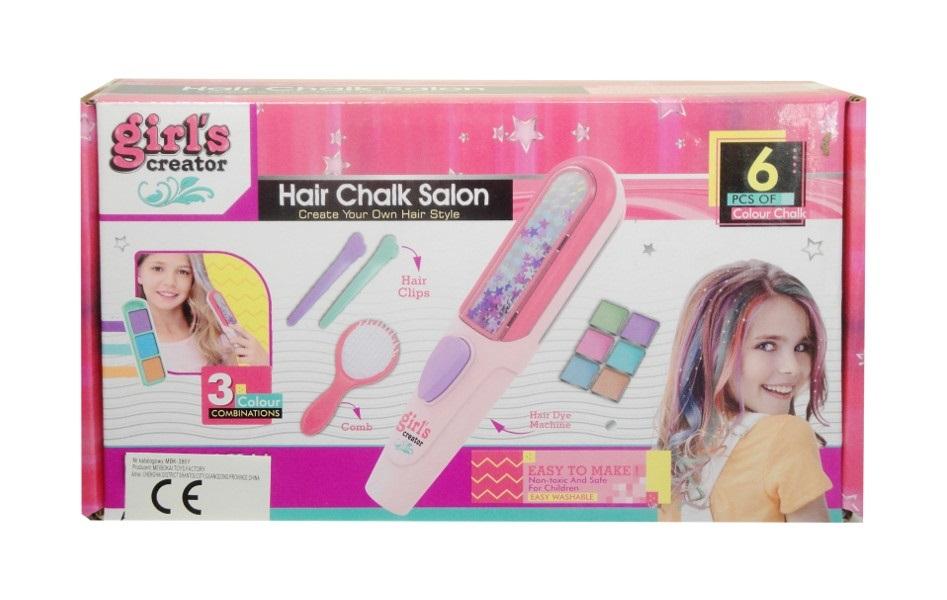 Zestaw piękności dla dziewczynki kredki do włosów. Stwórz unikatową stylizację. W zestawie znajduje się m.in. 6 kolorów kredek, grzebień, klipsy do włosów oraz przyrząd do farbowania włosów. Produkt zapakowany w kartonowe opakowanie. Podane wymiary są wymiarami opakowania.