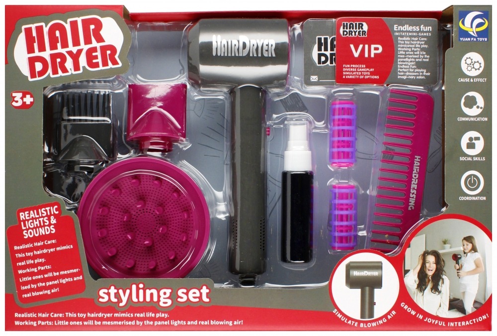 Wymaga zasilania bateriami - suszarka do włosów 2x AALR06- nie załączone do zestawu.