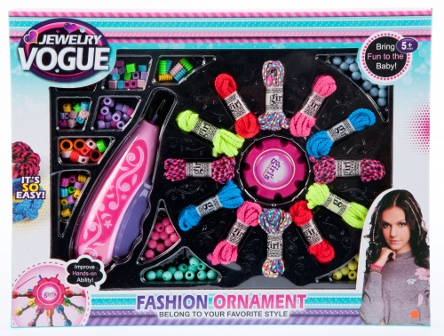 Zawartość zestawu maszynka do zaplatania włosów, 12 x kolorowych sznurków do zaplatania, 11 x zestawów kolorowych koralików, igła plastikowa.