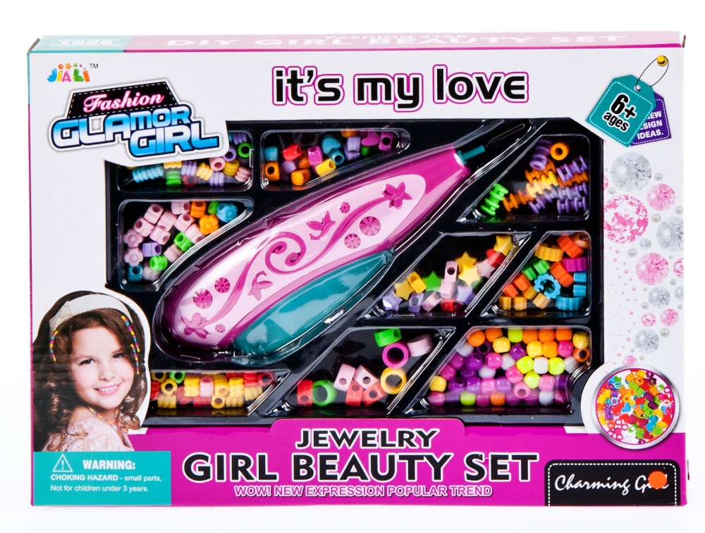 Zawartość zestawu maszynka do zaplatania włosów, 9 x zestaw kolorowych koralików, szablony.