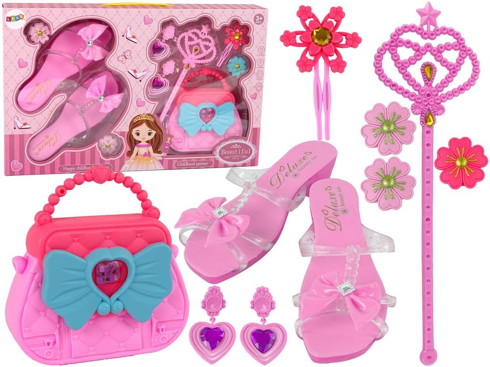 Zestaw Piękności Pantofelek Torebka Różowy Spinki Każda mała dziewczynka uwielbia stroić się, naśladując swoją mamę. Teraz ma taką możliwość! Podaruj jej zestaw księżniczki, która skrywa w sobie same najpotrzebniejsze do tego akcesoria. Zestaw został zaprojektowany z myślą o małych dziewczynkach, dlatego cały spowity jest różowymi oraz pastelowymi elementami i błyszczącymi kamieniami i kokardkami. Jesteśmy pewni, że własny zestaw o tak uroczym wyglądzie sprawi, że dziewczynki zamienią się w prawdziwe księżniczki gotowe na bal. Zestaw przyciągnie wzrok dziewczynek, zachęcając je do zabawy. Co ciekawego znajdą w środku? Ważnym elementem zestawu są klapki na niskim obcasie ozdobione kokardką, czyli to co księżniczki uwielbiają najbardziej. Ponadto cała seria akcesoriów czyli torebka, różdżka, kolczyki-klipsy, spinki, wsuwki. Zestaw idealnie sprawdzi się podczas zabaw w domu oraz na balach karnawałowych. W zestawie znajdują się: - pantofelki na obcasie - 18 cm - otwierana torebka - kolczyki (Klipsy) - różdżka - spinki Wymiary elementów zestawu: -torebka: 13 cm x 13 cm x 4 cm - różdżka: 20 cm - bucik: 18 cm x 7 cm x 5 cm Wymiary opakowania: 41 cm x 26 cm x 6 cm Przeznaczona dla dzieci powyżej 3 roku życia. Zgodne z normą EN71 i certyfikatem CE.