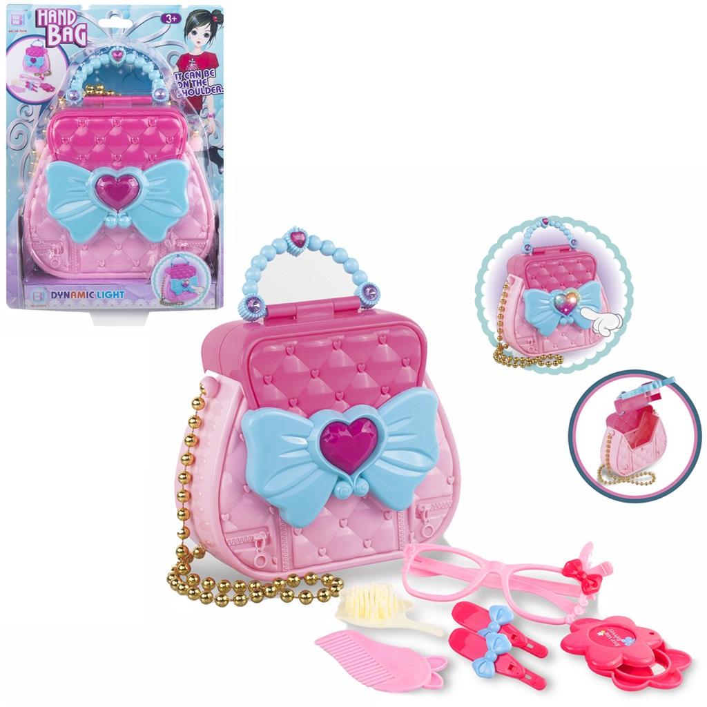Zestaw piękności zapakowany w torebkę, która ma światło na przycisku.