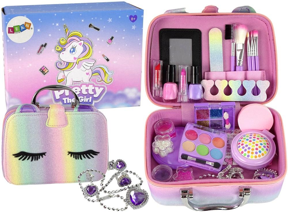 Zestaw Piękności w Walizce Brokatowa To bajeczna i urocza zabawka, która przenosi dzieci w magiczny świat kreatywnej zabawy. Ta wyjątkowa walizka została zaprojektowana tak, aby była nie tylko estetyczna, ale także wygodna i praktyczna w użytkowaniu. Za sprawą poręcznego suwaka, jej otwieranie i zamykanie staje się dziecinnie proste, dzięki czemu młode damy mogą mieć dostęp do swojego zestawu piękności w każdym miejscu i czasie. Uchwyt, wykonany z trwałego plastiku, pozwala na wygodne przenoszenie jej. Walizka wyposażona jest w cztery stopki na spodzie, co zapewnia stabilne i bezpieczne postawienie jej na płaskiej powierzchni, podczas gdy Wasze pociechy korzystają z zawartości zestawu. Wewnątrz znajduje się bogaty zestaw akcesoriów do kreatywnej zabawy i eksperymentowania z wyglądem. Dzieci znajdą tu paletki cieni w sześciu pięknych, różnorodnych kolorach wraz z pędzelkiem oraz 4 brokatowe cienie z pacynką, które dodają blasku i magii każdemu makijażowi. Wszystko to wzbogacone pudrem i dwoma brokatami, które umożliwiają tworzenie pięknych efektów. Dopełnieniem całości są 6 różnych pędzli, kolorowe błyszczyki, szminki i lakiery do paznokci, które umożliwiają stworzenie niepowtarzalnego i kolorowego wyglądu. Aby zadbać o włosy, w zestawie znajduje się także urocza szczotka. Warto dodać, że zestaw zawiera również wyjątkową biżuterię, taką jak naszyjnik, pierścionek oraz kolczyki, która idealnie dopełni całą stylizację. Dla miłośniczek zdobienia paznokci przewidziano 5 szablonów z różnorodnymi wzorkami, brokatowy pilniczek, oraz separator kosmetyczny. Wewnątrz walizki znajduje się lusterko, dzięki któremu dzieci mogą podziwiać swoje efekty i doskonalić umiejętności w sztuce makijażu. To nie tylko idealna zabawka dla małych kreatywnych artystek, ale także doskonały sposób na rozwijanie wyobraźni, umiejętności manualnych i eksplorację własnego stylu. Wymiary walizki wynoszą: 19 cm x 18 cm x 7,5 cm, co sprawia, że można zabrać ją wszędzie ze sobą. Elementy zestawu: - walizka - 5 różnych pędzli - brokatowy pilnik - puder wraz z puszkiem - paletka 4 brokatowych cieni wraz z pacynką - paletka 6 cieni wraz z pędzelkiem - 2 brokaty - 2 błyszczyki - 2 szminki - 2 kolorowe lakiery - brokatowy separator kosmetyczny - szczotka do włosów - naszyjnik - kolczyki - pierścionek Wymiary walizki: 19 cm x 18 cm x 7,5 cm Wymiary opakowania: 21 cm x 15 cm x 8 cm Posiada certyfikat CE, ponadto jest zgodny z normą EN71. Zabawka przeznaczona jest dla dzieci powyżej 8 roku życia.