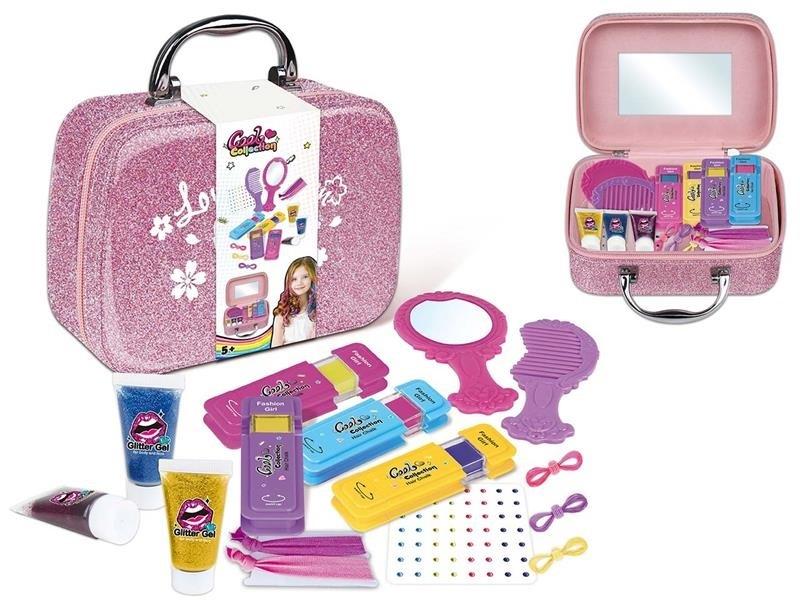 Zestaw piękności z kredą do włosów w kuferku. Luksusowy brokatowy kuferek zamykany jest na zamek błyskawiczny. Zestaw zawiera kolorowe kredy do włosów oraz inne akcesoria do ozdabiania włosów.