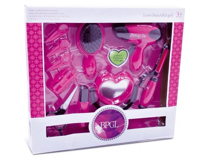 Zestaw zawiera: lusterko, szczotkę, suszarkę, lokówkę, spinki, klamerkę, nożyczki oraz lakier.