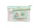 W skład zestawu wchodzą przezroczysta saszetka z logo, długopis z niebieskim wkłądem, zakreślacz, zestaw małych spinaczy, temperówka z motywem Pusheen, ołówek z topem oraz zeszyt A5. Taki zestaw świetnie sprawdzi się podczas zajęć lekcyjnych, a także podczas podróży.