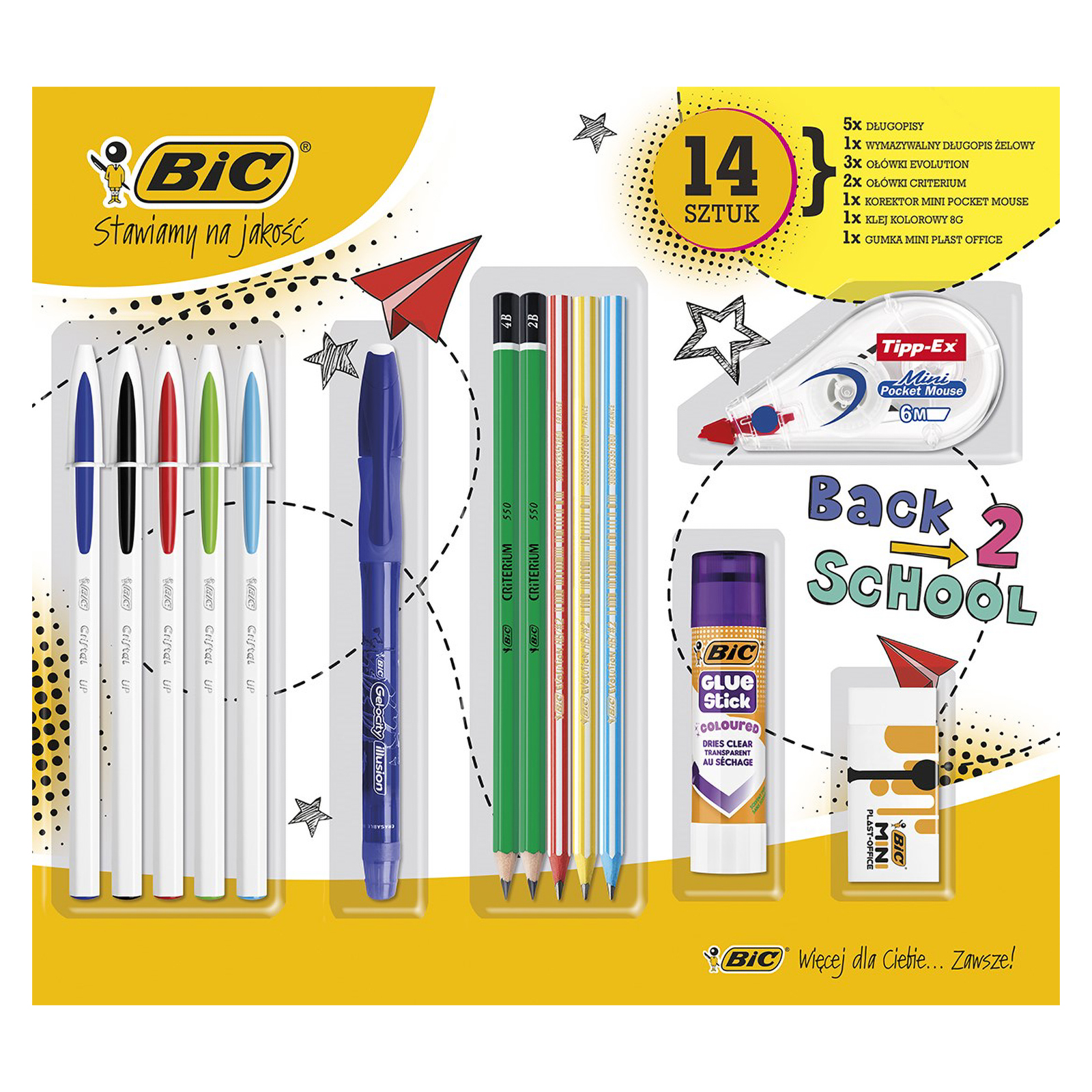 14 wysokiej jakości produktów szkolnych: 5 długopisów BIC Cristal Up, 1 wymazywalny długopis BIC Gel-Ocity Illusion, 2 ołówki BIC Criterium (2B i 4B), 3 ołówki BIC Evolution Stripes, 1 kieszonkowy korektor Mini Pocket Mouse, 1 klej w sztyfcie BIC Coloured 8g oraz gumkę BIC Mini Plast-Office.