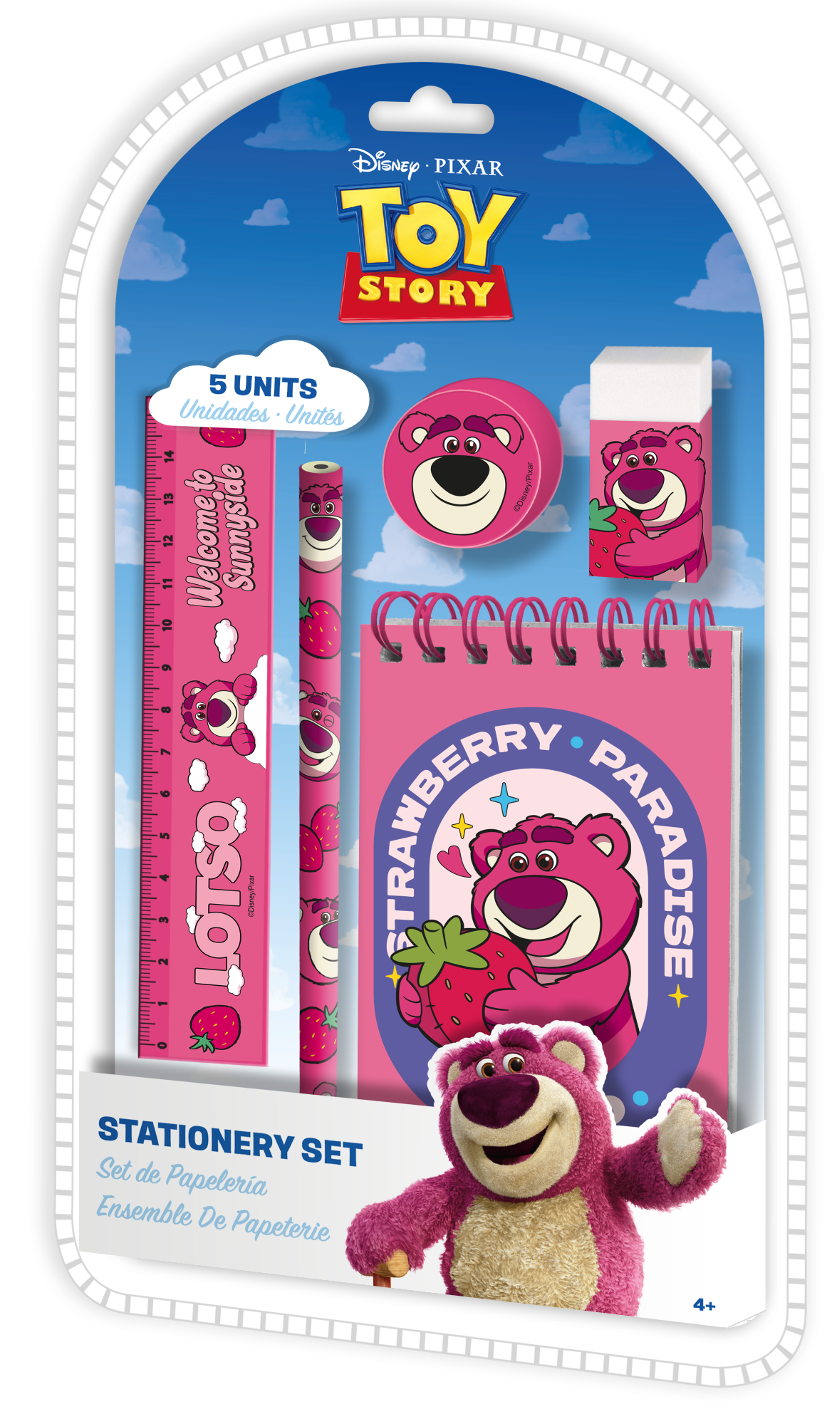 Zestaw pismienniczy z motywem Lotso, to idealny produkt dla dziecka które chcemy wyposażyć w podstawowe akcesoria do pisania. • Zestaw pismienniczy 5 el.• Wymiary: 15x26x2 cm• Materiał: Plastik , papier• Zawartość: kołonotatnik , gumka, temperówka, linijka, ołówek