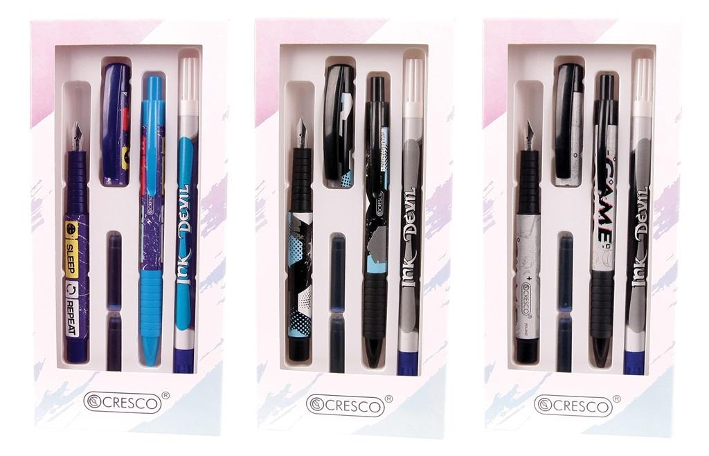 Zestaw piśmienniczy z serii COLLEGE zawierający pióro + długopis + wymazywacz z korektorem oraz 2 naboje. Całość zapakowane w estetyczne etui.