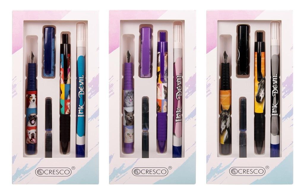Zestaw piśmienniczy z serii COLLEGE zawierający pióro + długopis + wymazywacz z korektorem oraz 2 naboje. Całość zapakowane w estetyczne etui. Mix wzorów