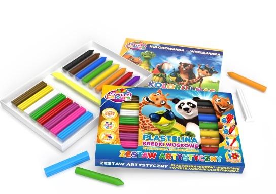 Zestaw artystyczny: 8 kol plastelin, 8 kolorów kredek +10 kart do kolorowania lub wyklejania.