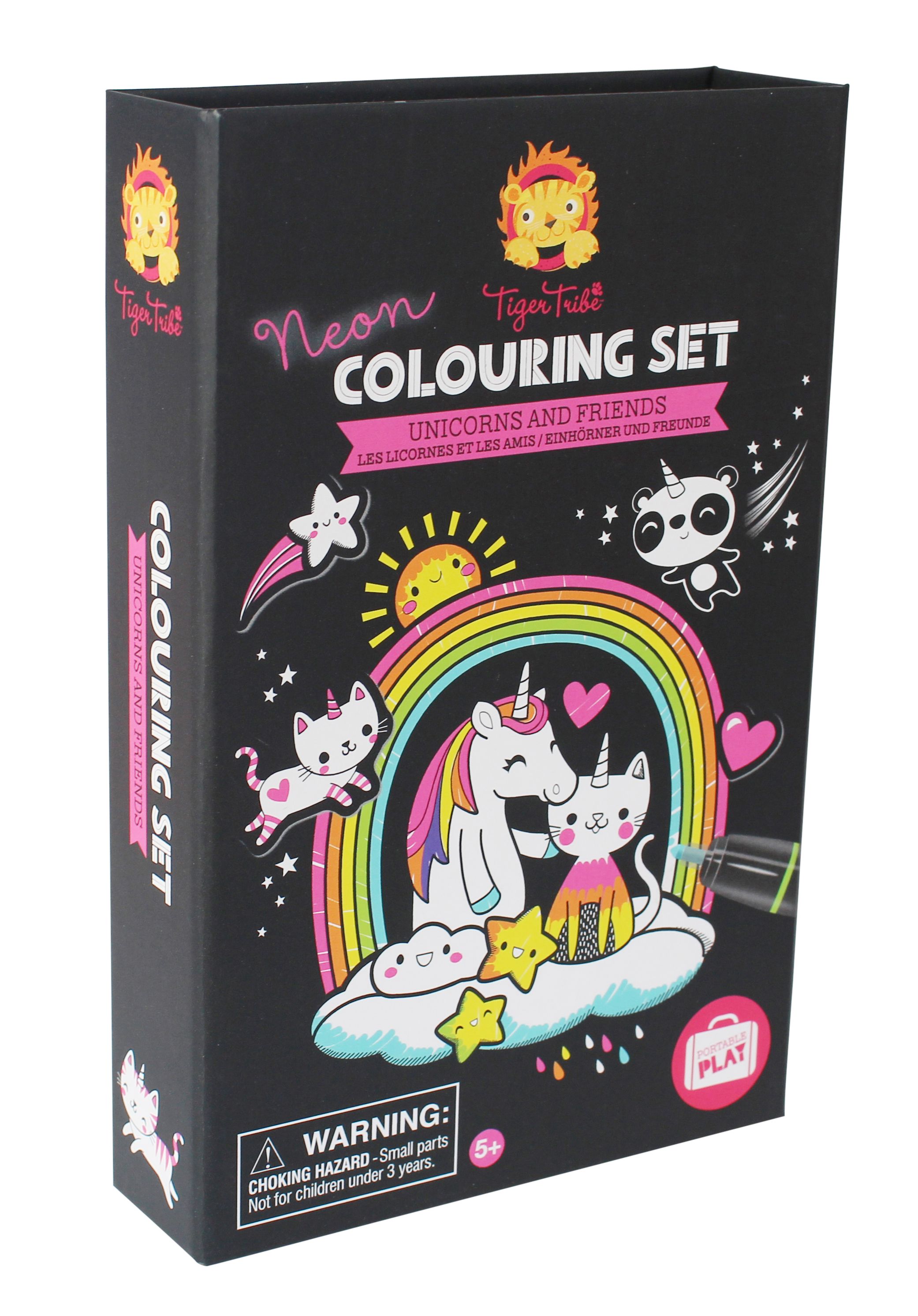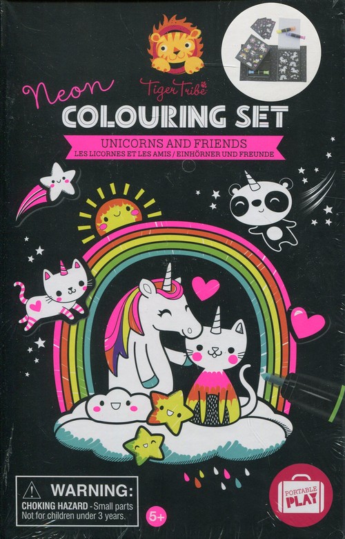 Kreatywny zestaw Tiger Tribe zawiera karty z białymi obrazkami na czarnym tle. Zadaniem dziecka jest pokolorowanie obrazków neonowymi flamastrami oraz przyozdobienie ich naklejkami. W komplecie: kolorowanka z 36 stronami, 3 dwustronne markery i 5 arkuszy z naklejkami. Zabawka może być dobrym pomysłem na nudę podczas podróży, gdyż wszystkie akcesoria są wygodnie zapakowane w pudełko. Wiek 5+