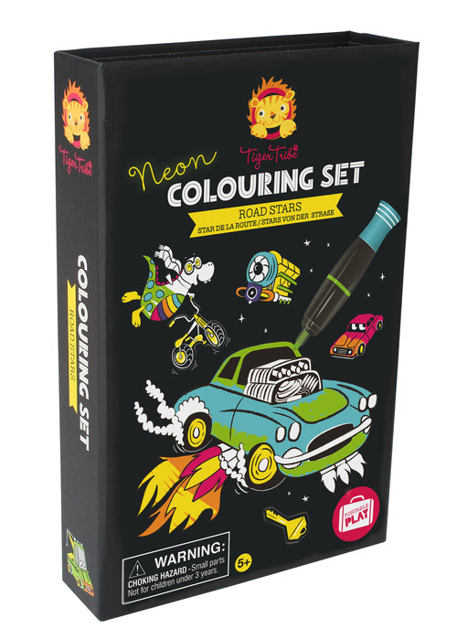 Kreatywny zestaw Tiger Tribe zawiera karty z białymi obrazkami na czarnym tle. Zadaniem dziecka jest pokolorowanie obrazków neonowymi flamastrami oraz przyozdobienie ich naklejkami. W komplecie: kolorowanka z 36 stronami, 3 dwustronne markery i 5 arkuszy z naklejkami. Zabawka może być dobrym pomysłem na nudę podczas podróży, gdyż wszystkie akcesoria są wygodnie zapakowane w pudełko. Tiger Tribe to marka pełna pomysłowych kreatywnych zestawów idealnych na podróż. Wszystkie pakowane są w solidne pudełka, które nie zajmują dużo miejsca i zwykle są zamykane na magnes. Ich zawartość np. notesiki są trwale przymocowane w środku opakowania, a naklejki, kredki itp. mają swoje miejsce w wewnętrznym pudełeczku.