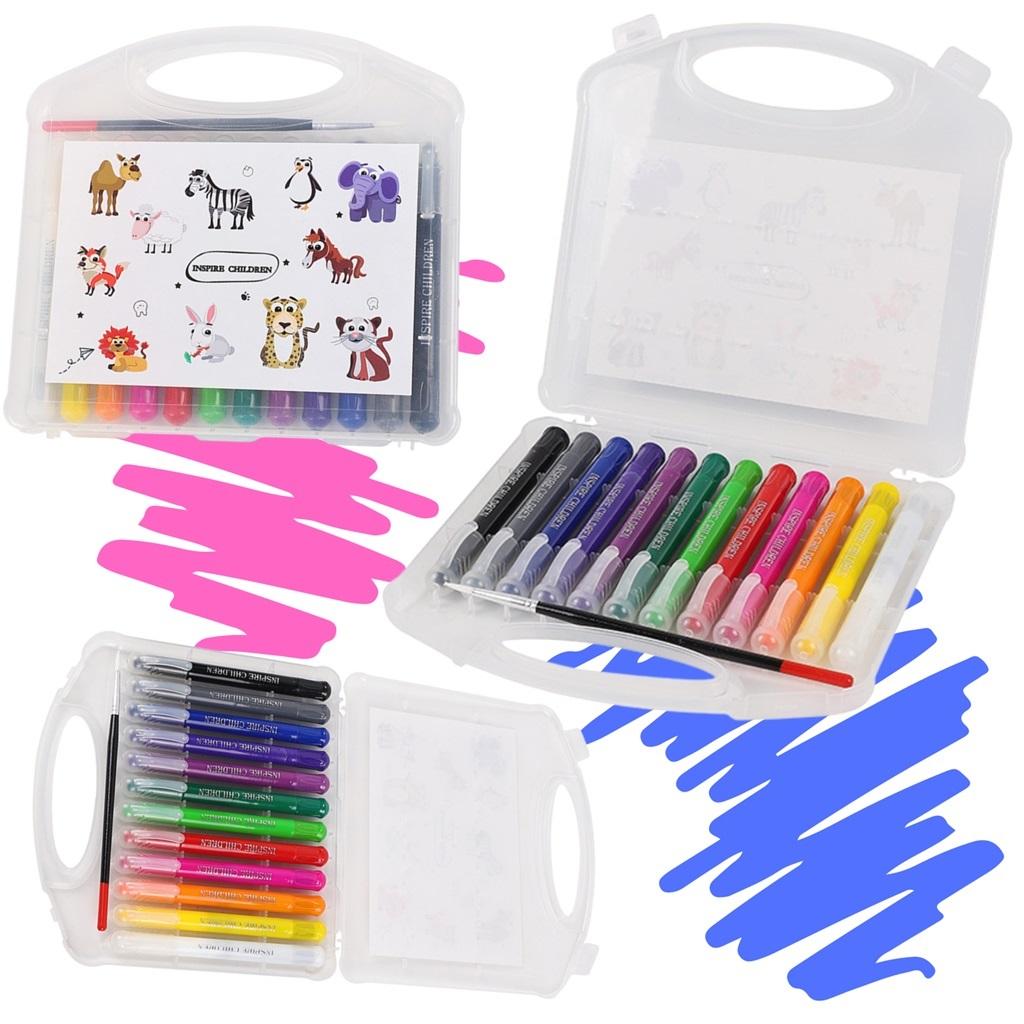 Niesamowity zestaw plastyczny składający się z 12 kolorowych pisaków oraz pędzelka, to idealny prezent dla każdego małego artysty. Miękkie i przyjemne w użytkowaniu wodne mazaki wprowadzą dzieci w zupełnie nową odsłonę malowania! Przenośne, szczelnie zamknięte opakowanie zapobiegnie gubieniu się elementów i pozwoli na komfortowe przechowywanie zestawu.