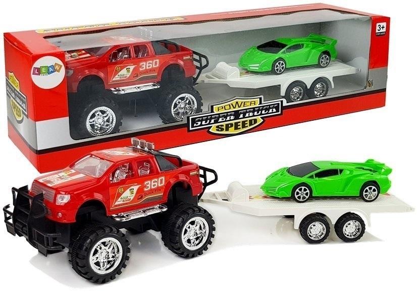 Auto terenowe, dla którego żadna przeszkoda nie jest straszna. Doskonale spisuje się zarówno na asfalcie, jak i na nierównych kamieniach. Zestaw stworzony dla miłośników samochodów, ponieważ zawiera aż dwa samochody w różnych stylach. Pierwszy z nich to czerwony MONSTER TRUCK, który ma możliwość przypięcia lawety, która jest dołączona do zestawu. Drugi zaś to czarne BMW, które można przewozić na lawecie. Modele zostały wykonane z wytrzymałego na uderzenia plastiku.
