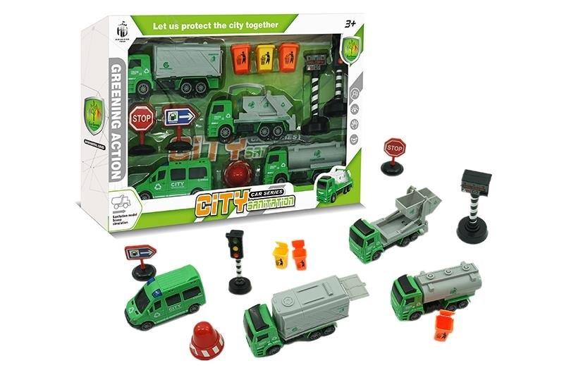 W zestawie: beczkowóz, śmieciarka, auto kontener, auto osobowe, sygnalizacja świetlna, znaki drogowe, 3 kosze na śmieci. Funkcje: napęd pull back, otwierany tył śmieciarki, ruchomy kontener. Długość auta: 12 cm.