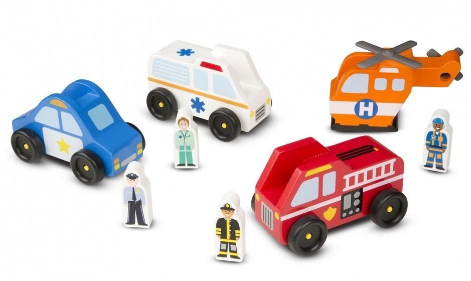 Cztery duże, drewniane pojazdy wraz z kierowcami. W zestawie radiowóz policyjny, samochód pogotowia ratunkowego, pojazd straży pożarnej oraz helikopter ratunkowy. Postaci kierowców odzwierciedlają zawody tych ratunkowych służb, są wykonane z grubych kawałków drewna dzięki czemu stabilnie stoją. Zestaw ten wspomaga rozwój społeczny dziecka poprzez możliwość  odgrywania ról i scen związanych z wykonywanymi zawodami ratunkowymi.