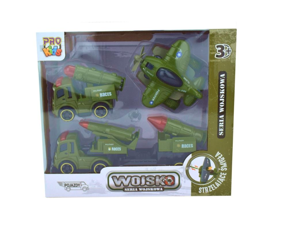 Zawiera: 3 różne pojazdy wojskowe. Samolot strzelający.