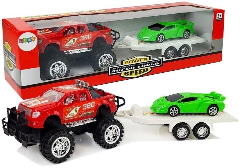 Auto terenowe z lawetą ,na której przewozi piękne, zielone auto sportowe z pewnością zapewni niezapomnianą zabawę z rówieśnikami i pobudzi Twoje dziecko do kreatywniej zabawy. Większe autko posiada napęd frykcyjny, wystarczy pociągnąć do tyłu i puścić, patrzeć jak mknie w przód. Lawetę można odłączyć, a wszystkimi pojazdami można bawić się oddzielnie lub łączyć w całość.