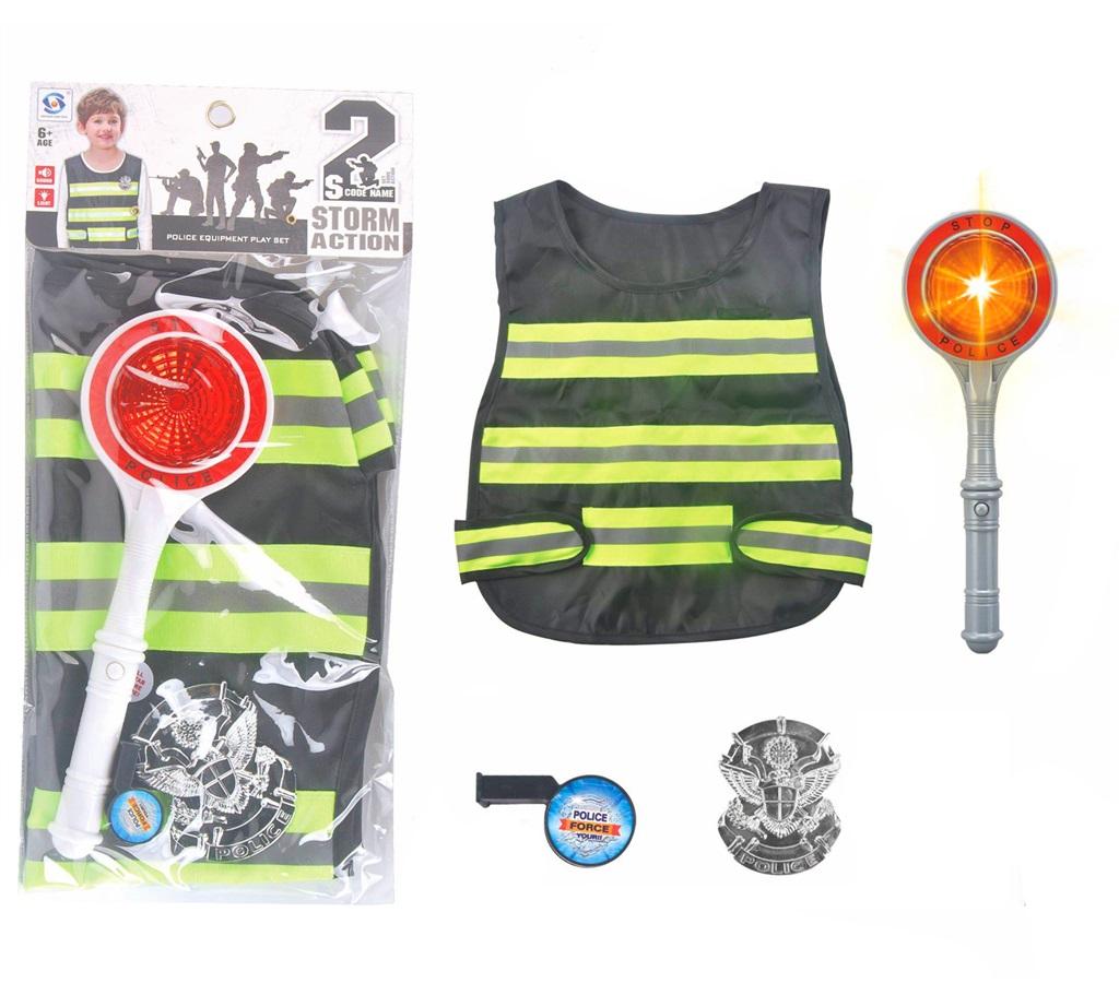 Komplet akcesoriów do kostiumu policjanta. Duży zestaw atrybutów policjanta: policyjny lizak ze światłem, kamizaelka odznaka . Pełny zestaw dodatków do dziecięcego przebrania policjanta na bal przebierańców, zabawy tematyczne, halloween, urodziny.