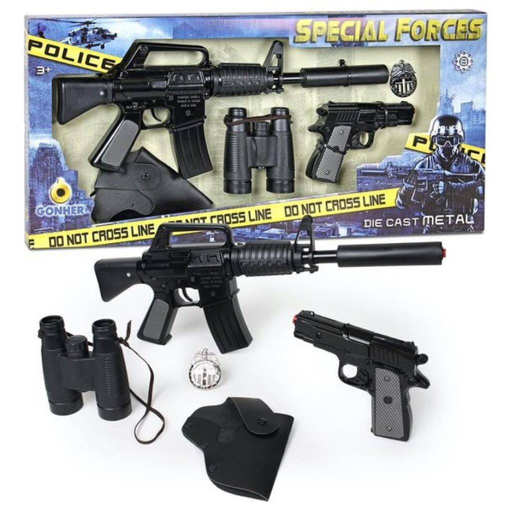 Zestaw policjanta, zawiera: karabin maszynowy, pistolet, kaburę, odznakę, granat oraz lornetkę. Wiek: 3+. Wymiary opakowania: 64x30x5cm. Szt./karton: 6