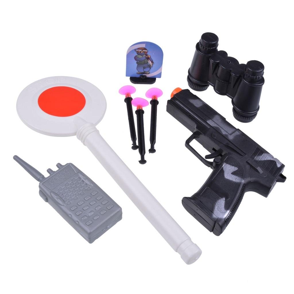 Komplet akcesoriów do kostiumu policjanta. Duży zestaw atrybutów policjanta: policyjny lizak, plastikowe lotki z przyssawkami, pistolet na lotki, imitacja krótkofalówki, lornetka, mały cel do lotek. Pełny zestaw dodatków do dziecięcego przebrania policjanta na bal przebierańców, zabawy tematyczne, halloween, urodziny.