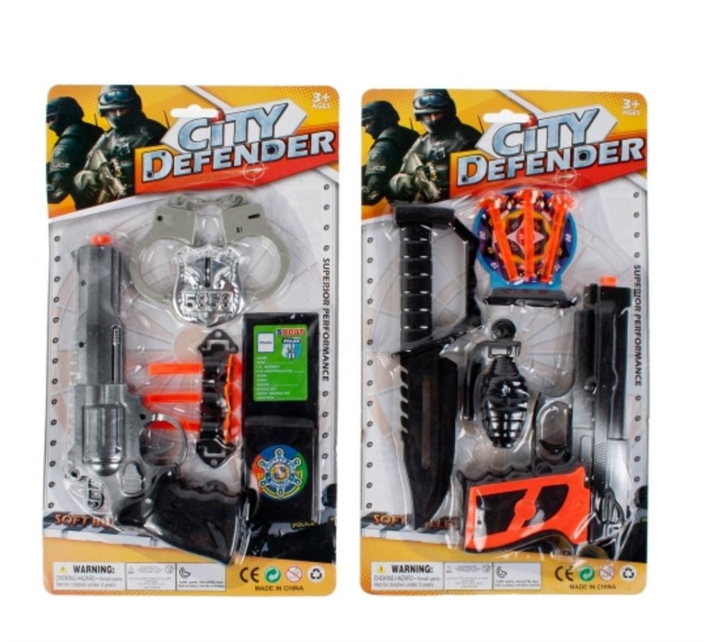 W zestawie akcesoria niezbędne dla prawdziwego antyterrorysty. Między innymi pistolet, kajdanki, granat itp.