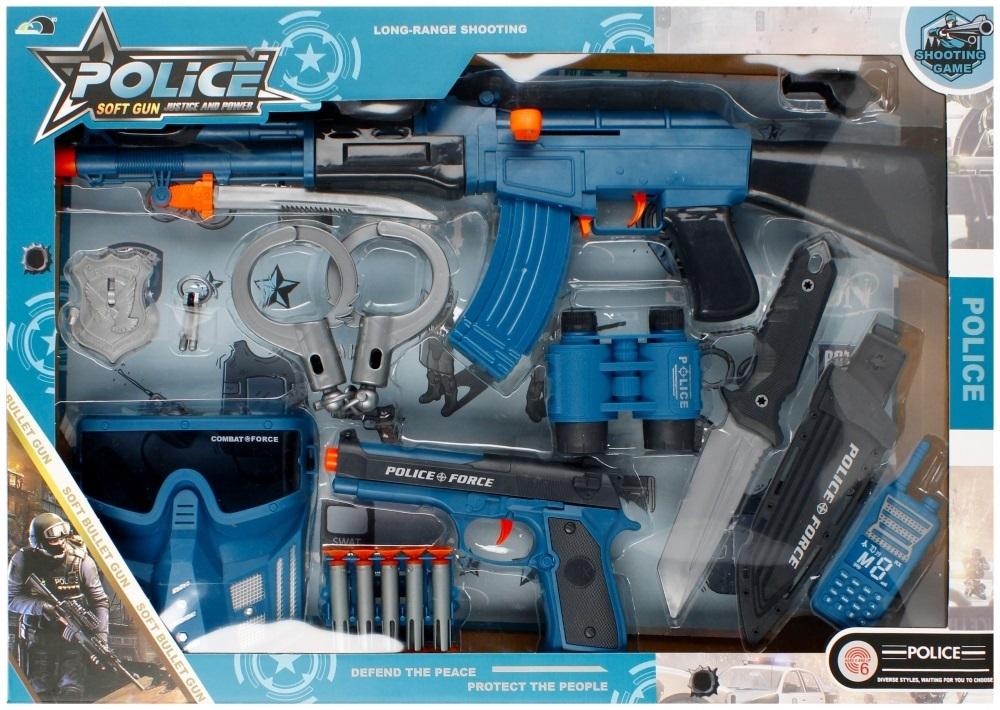 Zalety produktu: rozbudza kreatywność dziecka. Czas przygotować Bazę Policyjną na ochronę przed niebezpieczeństwem. Zabawa Zestawem Policyjnym MEGA CREATIVE dostarczy każdemu dziecku sporą dawkę dobrej zabawy! Poczuj się jak prawdziwy Policjant. Zawartość zestawu: pistolet, karabin maszynowy, 5x pociski piankowe, kajdanki, odznaka, lornetka, maska, krótkofalówka, nóż, gwizdek . Całość wykonana z plastiku. Wymiary/waga/baterie: wymiary produktu (dł. x wys. x gł.) [cm]:-pistolet 20x13x3 ,-karabin 58x18x4, waga produktu bez opakowania [kg]: 0,51 kg, wymiary opakowania (dł. x wys. x gł.) [cm] 60x42x6,waga produktu w opakowaniu [kg]: 0,95 kg, nie wymaga zasilania bateriami. Zabawka przeznaczona dla dzieci w wieku: 3+.