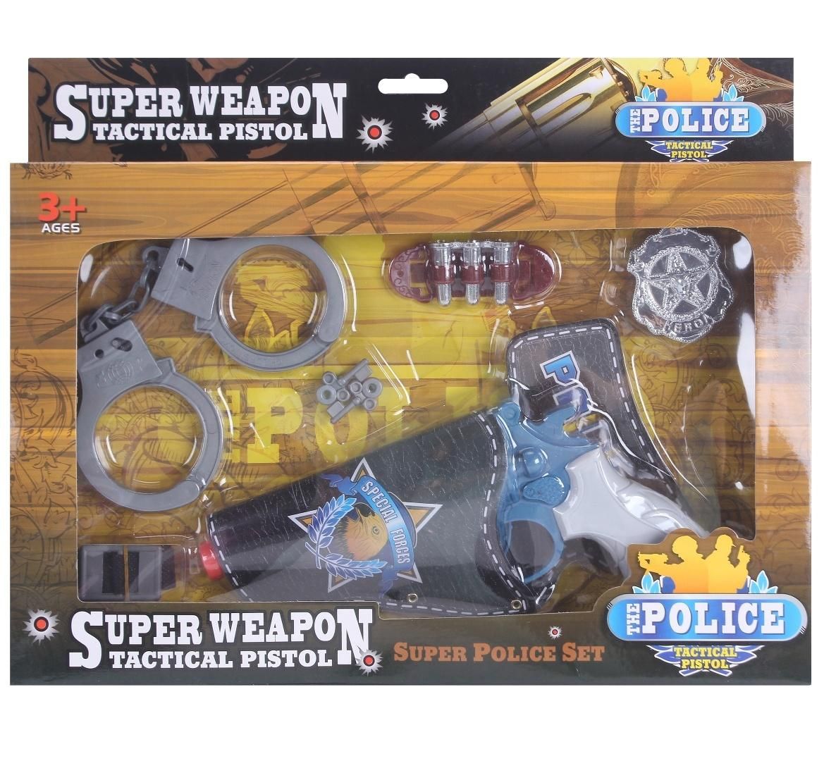 Zestaw Policyjny "Super Police Set" - Pistolet, Kajdanki i Odznaka Przygotuj się na misję! Ten kompleksowy zestaw policyjny "Super Police Set" pozwoli Twojemu dziecku na wcielenie się w rolę stróża prawa lub agenta służb specjalnych, zapewniając godziny fascynującej zabawy w odgrywanie ról. Idealny dla małych fanów akcji i przygód. Zawartość zestawu: Zabawkowy pistolet: Stylizowany na "taktyczny pistolet" (TACTICAL PISTOL) z oznaczeniami "SPECIAL FORCES". Kabura: Praktyczna kabura na pistolet, umożliwiająca łatwy dostęp podczas akcji. Kajdanki: Plastikowe kajdanki, niezbędne podczas każdej policyjnej interwencji. Odznaka: Klasyczna odznaka policyjna (gwiazda szeryfa). Dodatkowe akcesoria: Imitacje naboi oraz inne drobne elementy, wzbogacające zabawę. Zalety zabawki: Zestaw został zaprojektowany z myślą o rozwijaniu wyobraźni i kreatywnej zabawie. Wcielanie się w role bohaterów pozwala dziecku na tworzenie własnych scenariuszy i uczenie się zasad odpowiedzialności. Informacje dodatkowe: Produkt wykonany z trwałego i bezpiecznego dla dzieci tworzywa sztucznego. Zestaw zapakowany w estetyczne pudełko. Przeznaczony dla dzieci od 3. roku życia. Wielkość opakowania: 35x23x4 cm