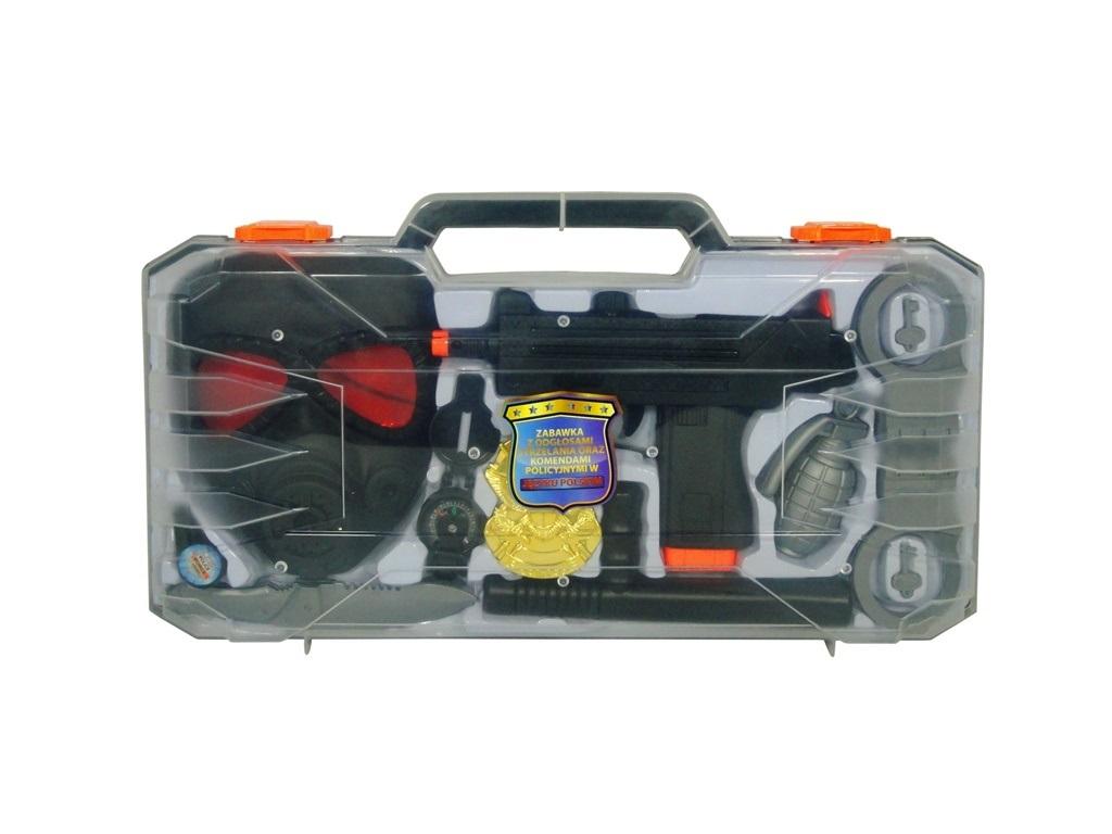 Zabawka z dźwiękami syreny policyjnej, strzelania, przeładowania broni oraz komendami policyjnymi w języku polskim: "Do wszystkich jednostek: Zgłaszam napad, ruszajmy do akcji", "Policja! Ręce do góry", "Stój, bo będę strzelał", "poddaj się, rzuć broń! Jesteś otoczony", "Jesteś aresztowany, jedziemy na komendę". W zestawie oprócz pistoletu znajduje się także m.in.: odznaka policyjna, kompas, granat, kajdanki, pałka.